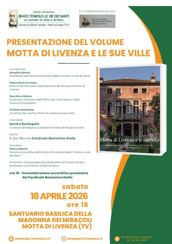 All’incontro, promosso dal Beato Toniolo in collaborazione con il Santuario Basilica della Madonna dei Miracoli, sono previsti i saluti introduttivi di Annalina Sartori, presidente dell’Istituto Beato Toniolo, Padre Mario Favretto, rettore del Santuario mottense, don Mirco Miotto, incaricato diocesano dell’ufficio per l’arte sacra e i beni culturali ecclesiastici, e Cristina Vendrame, curatrice dell’opera. Seguirà l’intervento principale di Sandro Barbagallo, mentre poi è in programma il saluto del cardinale Beniamino Stella. Il direttore scientifico IBT, Marco Zabotti, coordinerà l’incontro pubblico, aperto a tutti, che si concluderà con la visita guidata al Chiostro di San Francesco e al Chiostro di Sant’Antonio, soggetti speciali  dell’approfondimento a loro particolarmente dedicato dalla curatrice della pubblicazione, che si avvale del corredo fotografico di Pietro Casonato ed è stampata per i tipi di De Bastiani Editore.