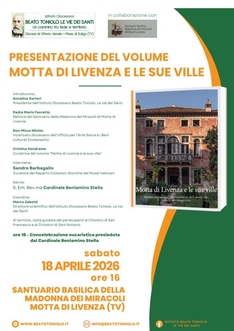 Ritorna graditissimo relatore a due importanti eventi il 18 e 19 aprile prossimi nella diocesi di Vittorio Veneto, promossi dall’Istituto Beato Toniolo, il dottor Sandro Barbagallo, curatore del reparto collezioni storiche dei Musei Vaticani e consulente dell’ufficio delle celebrazioni liturgiche del Sommo Pontefice. Dopo l’ottimo successo della giornata di cultura e formazione da lui guidata il 5 aprile 2025 a Vittorio Veneto, il dottor Barbagallo si era detto fin da subito ben felice di poter fare presto ritorno in diocesi: pertanto,  interverrà sabato 18 aprile pomeriggio alle 16 a Motta di Livenza, al Santuario Basilica della Madonna dei Miracoli, alla presentazione del volume “Motta di Livenza e le sue ville”, e guiderà l’evento di formazione IBT in programma a Oderzo nella mattinata di domenica 19 aprile, nella Sala delle Anfore del Museo Archeologico al civico 63 di via Garibaldi, dalle 10 alle 12.30.