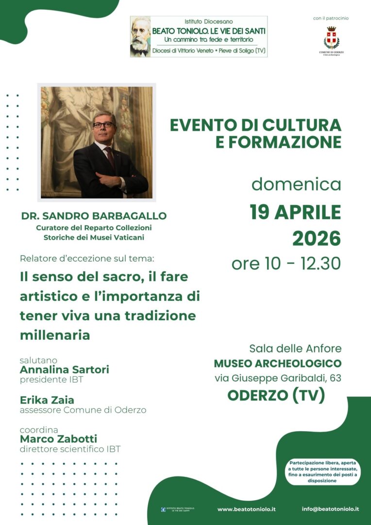Nella mattinata di domenica 19 aprile, dalle 10 alle 12.30,  nella Sala delle Anfore del Museo Archeologico di Oderzo il dottor Sandro Barbagallo sarà il relatore d’eccezione dell’evento di cultura e formazione organizzato dall’Istituto Diocesano Beato Toniolo. Le vie dei Santi, con il patrocinio del Comune di Oderzo, sul tema “Il senso del sacro, il fare artistico e l’importanza di tener viva una tradizione millenaria”. Ci saranno i saluti introduttivi di Annalina Sartori, presidente IBT, e di Erika Zaia, assessore al Comune di Oderzo. L’importante appuntamento, coordinato dal direttore scientifico IBT, Marco Zabotti, è a partecipazione libera, aperto a tutte le persone interessate, fino a esaurimento dei posti a disposizione.